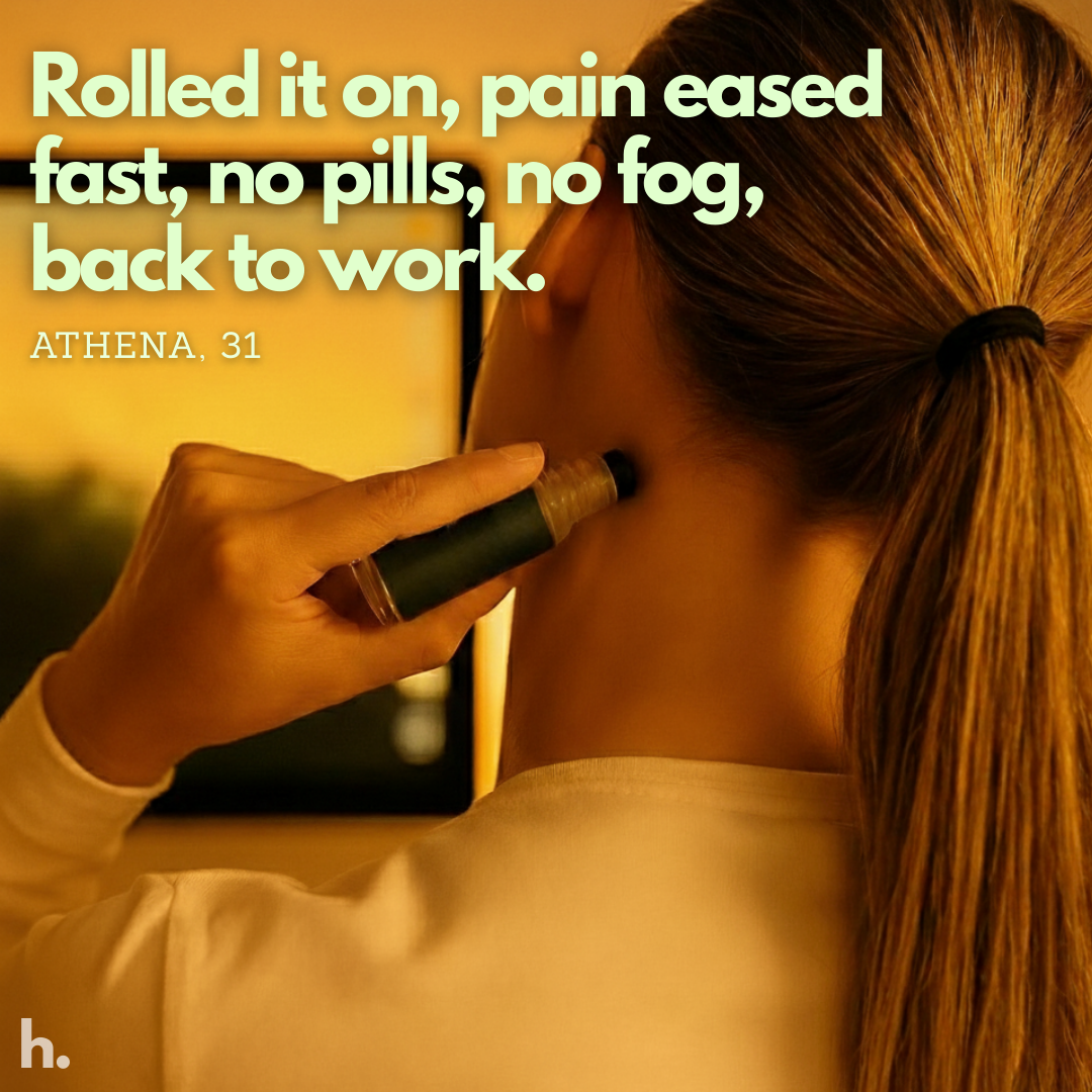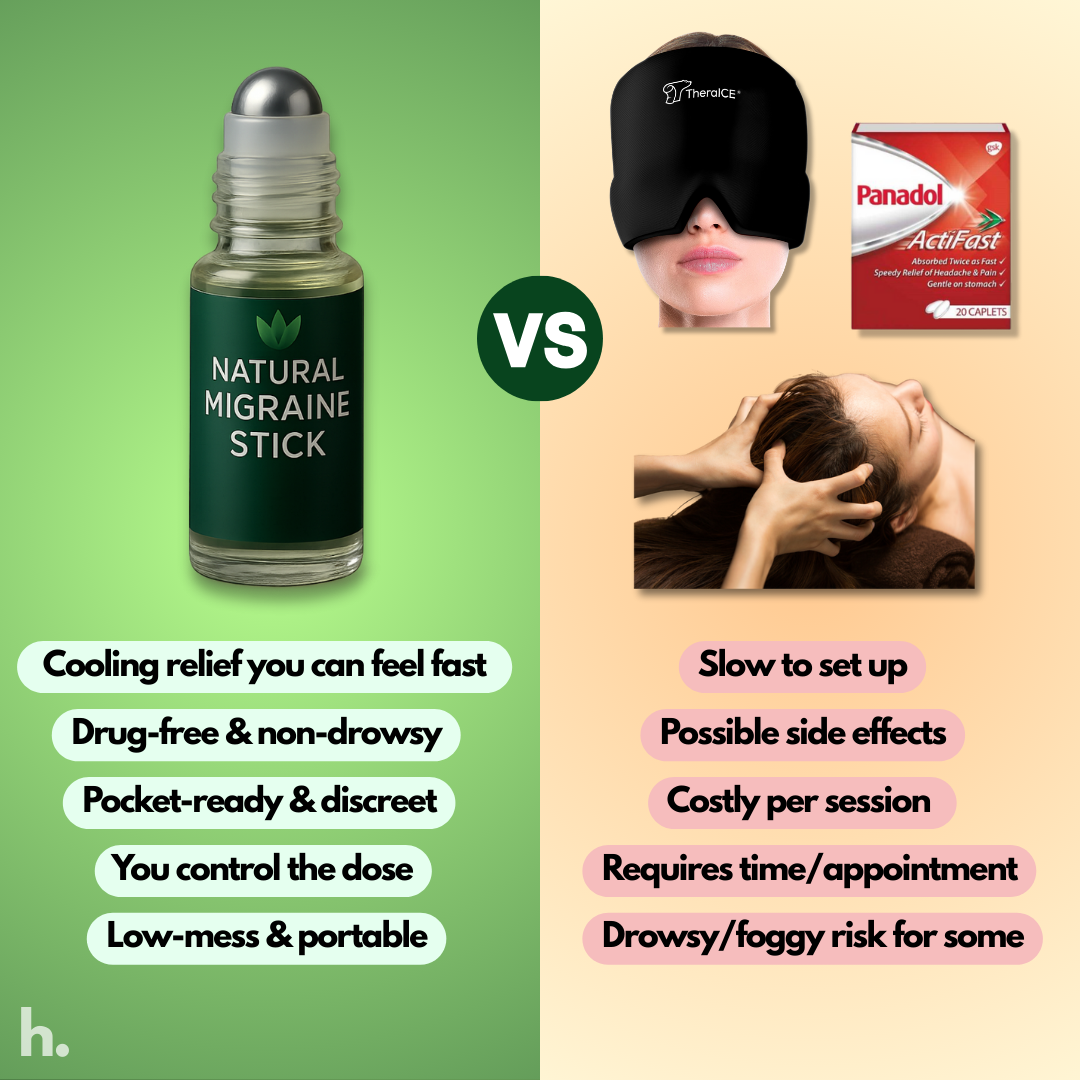 MigraEase™ uses a unique cooling mechanism (menthol-rich peppermint + soothing botanicals) to interrupt surface pain signaling and calm trigeminal-nerve irritation, giving your brain a chance to reset fast.